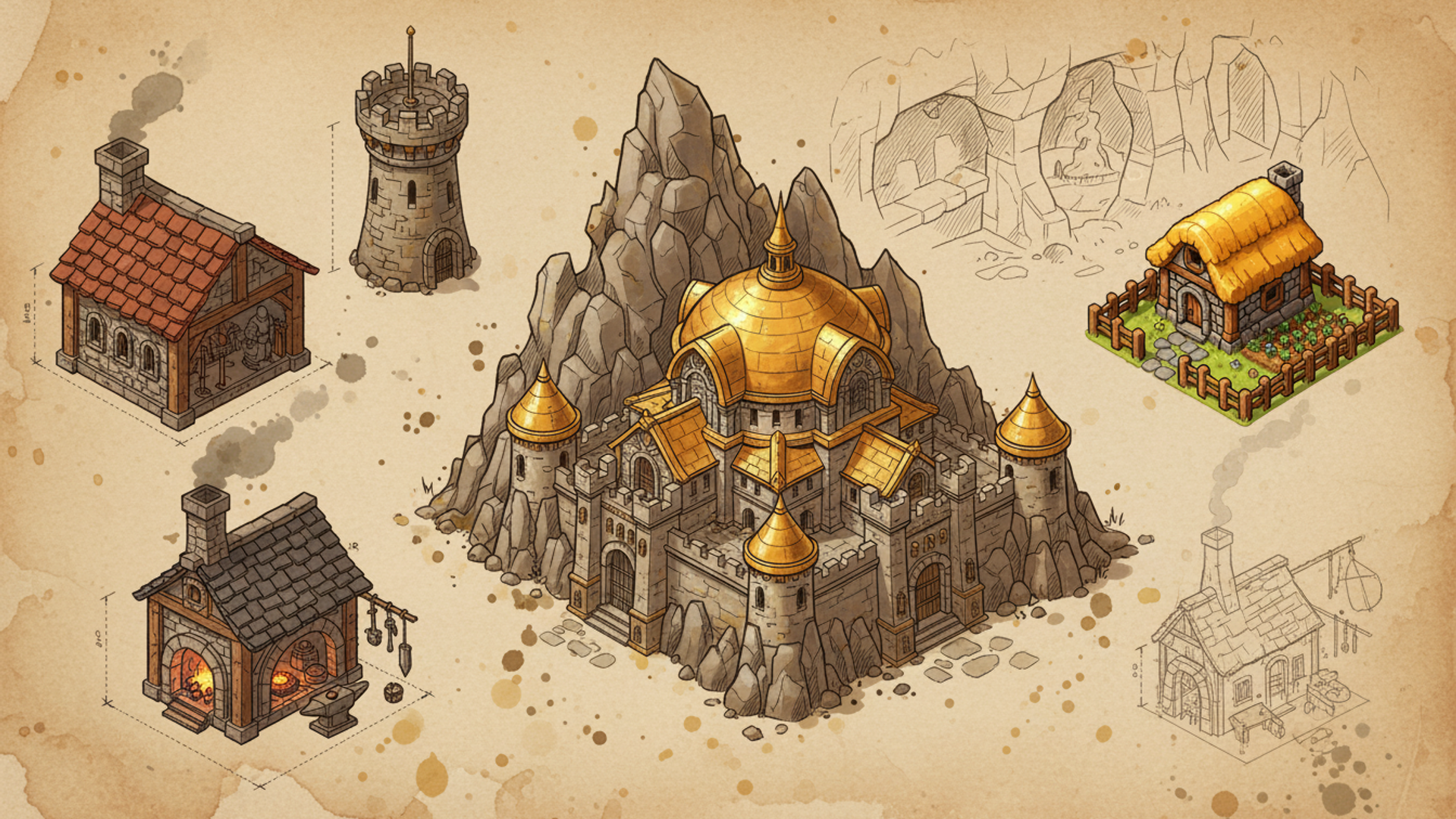 Key structures for the Dwarves faction. Build your economy, train your army, and fortify your defenses.